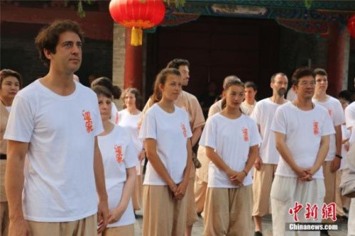 中新社郑州8月4日电 (李贵刚 邹相)背倚“归宗”,胸书“回家”。8月4日,来自美国、瑞典、德国、印尼等20余国的海外少林弟子漂洋过海前往千年古刹中国嵩山少林寺归山朝拜。