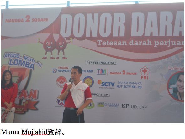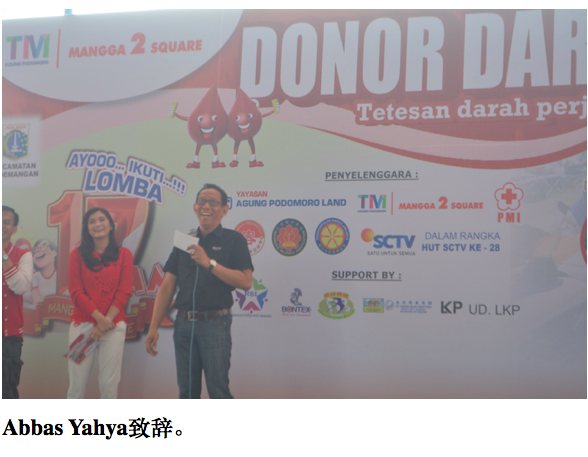 SCTV代表Abbas Yahya、印尼红十字会代表Sarina Salim医师、Mangga Dua Square商场代表Ria女士、Pademangan镇长Mumu Mujtahid都先后上台讲话,对客联总会、雅客联、梅州会馆等单位的大力支持和积极参与表示感谢。