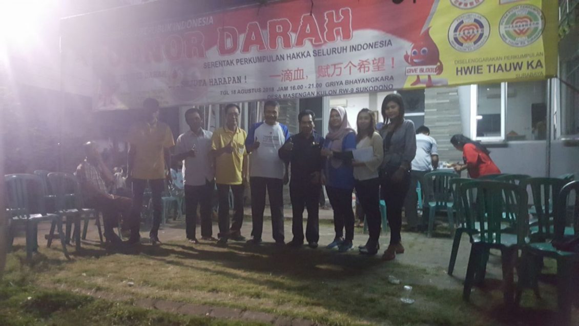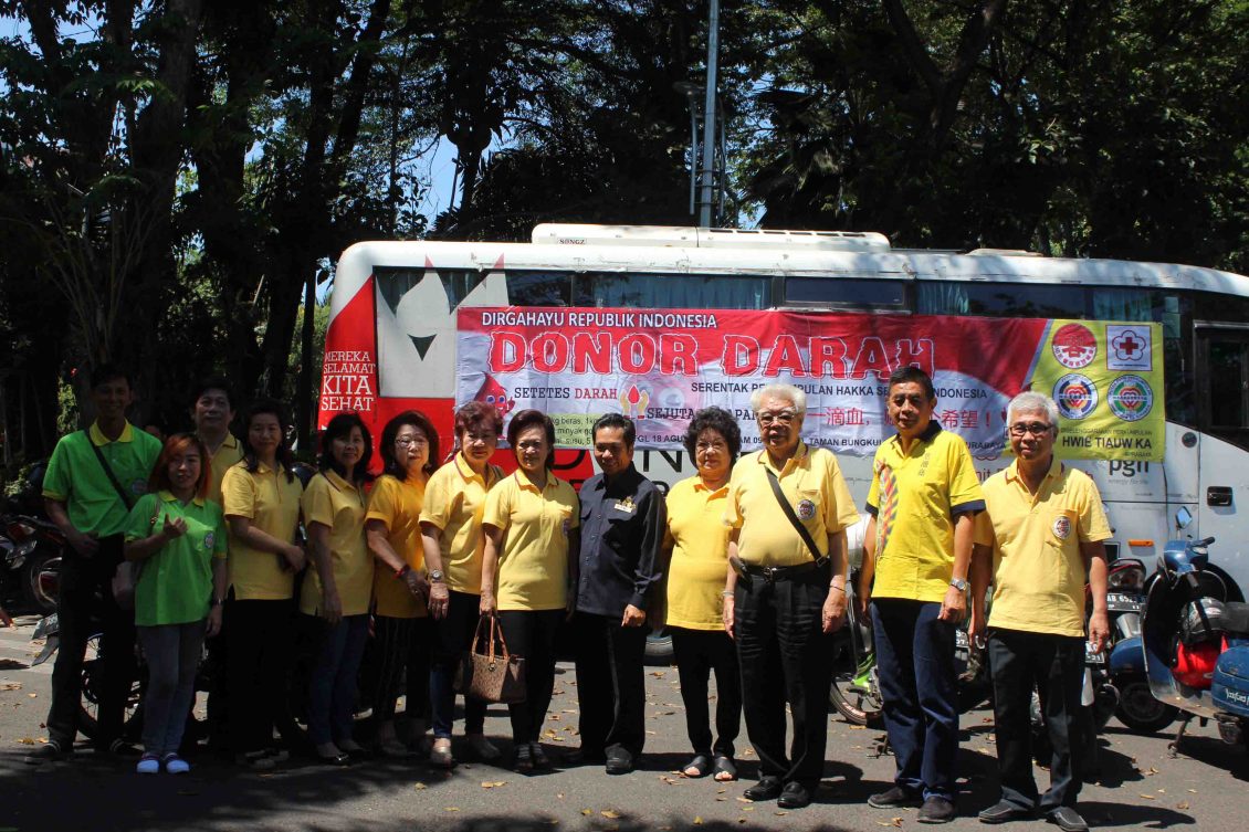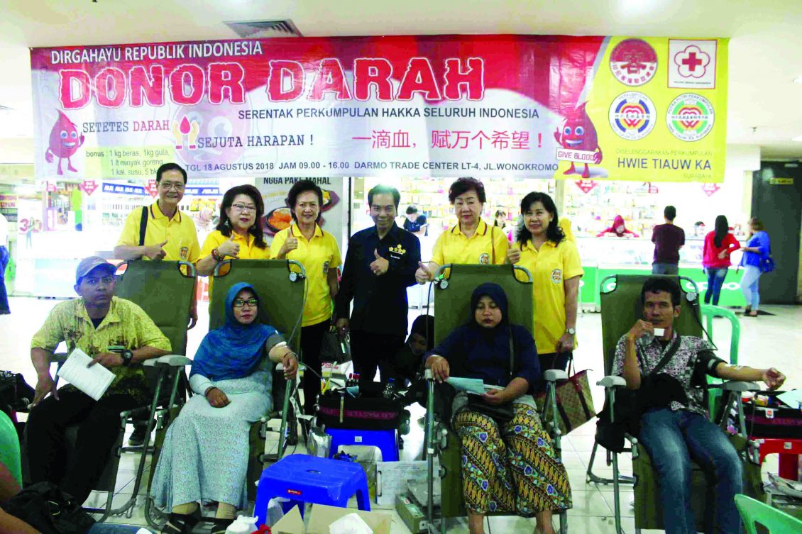 泗水惠潮嘉理事们在惠潮嘉主席李汉雄的领导下,前来监督捐血活动的进行。“为纪念印尼独立73周年, 全国客属联谊会统一在8月18日举办捐血活动。我们非常的赞赏捐血行动,因为一滴血可以救他人。我们必须更考虑到印尼民族,我们应该互相帮助,保持每一个人都健康”,李汉雄说。