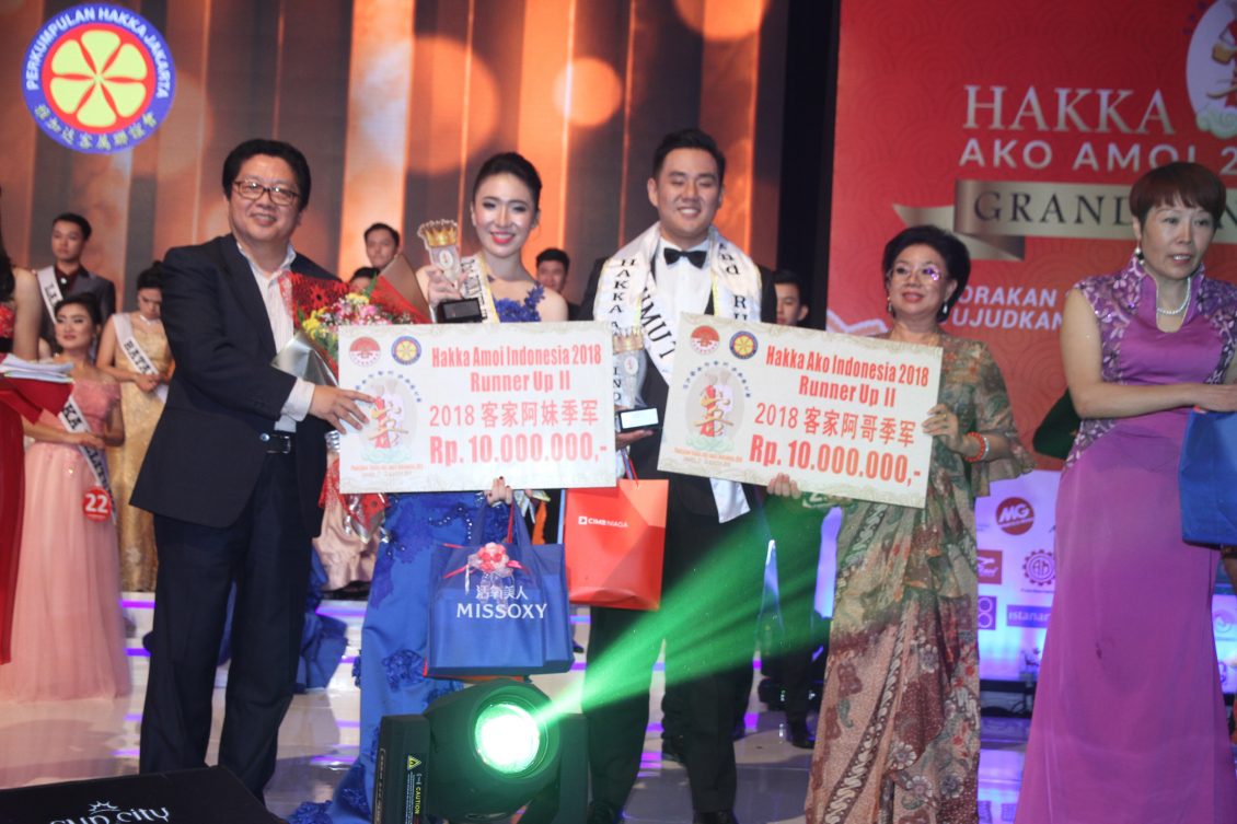 2018印尼客家阿哥最佳上镜来自西加的王美亮,2018印尼客家阿妹最佳上镜来自雅加达的候福平,2018印尼客家阿哥最佳友谊来自万邦的张志龙,2018印尼客家阿妹最佳友谊来自西加的杨碧凤,2018印尼最具客家心阿哥来自雅加达的华良,2018印尼最具客家心阿妹来自邦加·勿里洞的陈美华,2018印尼客家阿哥最佳才艺来自万隆的张福良,2018印尼客家阿妹最佳才艺来自雅加达的蔡雪梨,2018印尼客家阿哥最佳走秀来自雅加达的钟毅威,2018印尼客家阿妹最佳走秀来自苏北棉兰的Fanny Jauhari,2018印尼客家阿哥最佳公众演说来自苏北棉兰的Ali Sanjaya,2018印尼客家阿妹最佳公众演说来自雅加达的卓芳伊。