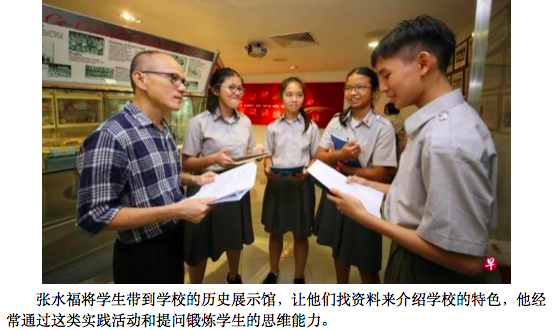 张水福有长达32年的教学经验,目前教导国初中学部学生。他受访时说:“教育不能只教知识和技能,现在的学生在某些方面懂得的东西可能比你还多。教育目标要延伸至培养学生的思维,所以我总爱追问学生‘为什么’,如何得出答案,让学生想一想他们的思路是否合理,这样的训练对写作尤其有帮助。有些学生的依赖性较大,懒得思考,我用问题反问他们,在引导后,他们其实是有想法的。”