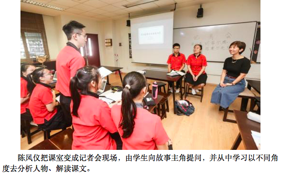 课室成为记者会现场,学生成了记者,提问扮演新闻人物的同学。这是正华中学教师陈凤仪(38岁)给学生设计的其中一项活动。她借由戏剧教学法,让学生通过角色扮演深入思考课文中故事人物的性格。参与提问的学生也能从不同角度去分析人物。