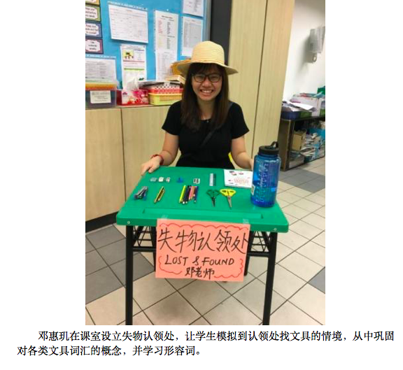 有时,课室也成了“失物认领处”,学生到认领处寻找文具,从中巩固对各类文具词汇的概念,学习如何形容物品。