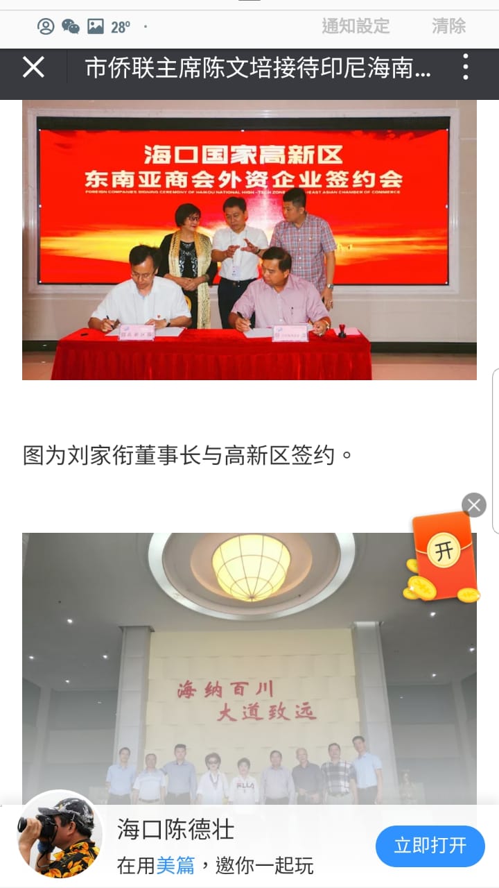 [海口讯] 2018争9月25日,印度尼西亚商会代表、Pt. Aquasolve Sanaria董事长刘家銜(印海总会总主席) 帯领雅加达海南联谊会主席萧世平及秘书长唐韵、财政杨冠莲、福利部主任王春光的外资企业代表,到海南省海口市高新区考察座谈并与高新区订了战略合作协议.