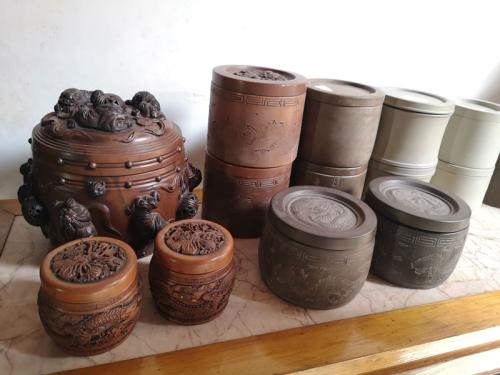 “我们先从抓蟋蟀的器具开始说起,这一个个用竹子制成的叫竹笼,配合这个小网罩,就是在野地里捕捉蟋蟀的工具。”朱红春一边介绍一边演示,说着拿起桌上的一个个灰色的圆柱体罐子,“这些就是用来存放蟋蟀的罐子,南方叫做‘南盆’,北方叫做‘北罐’。”