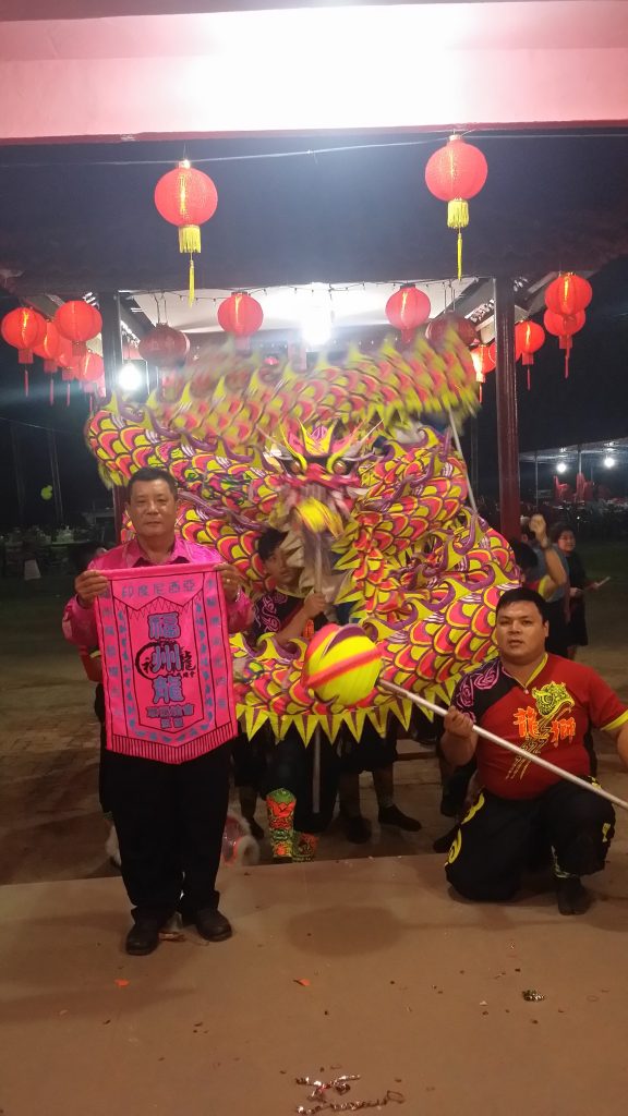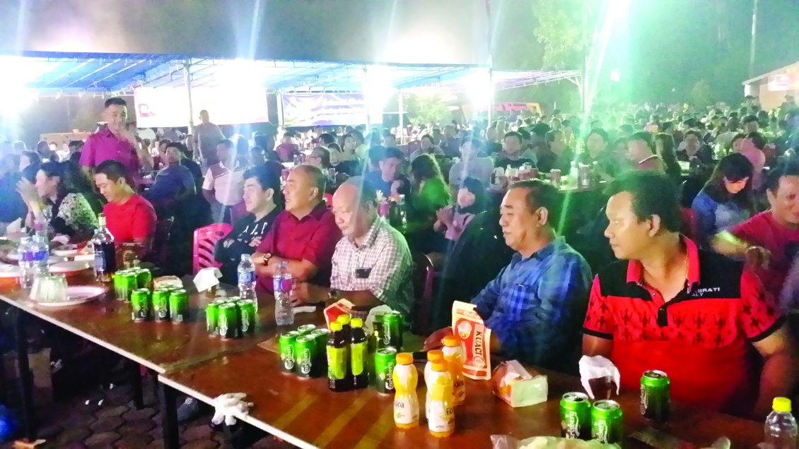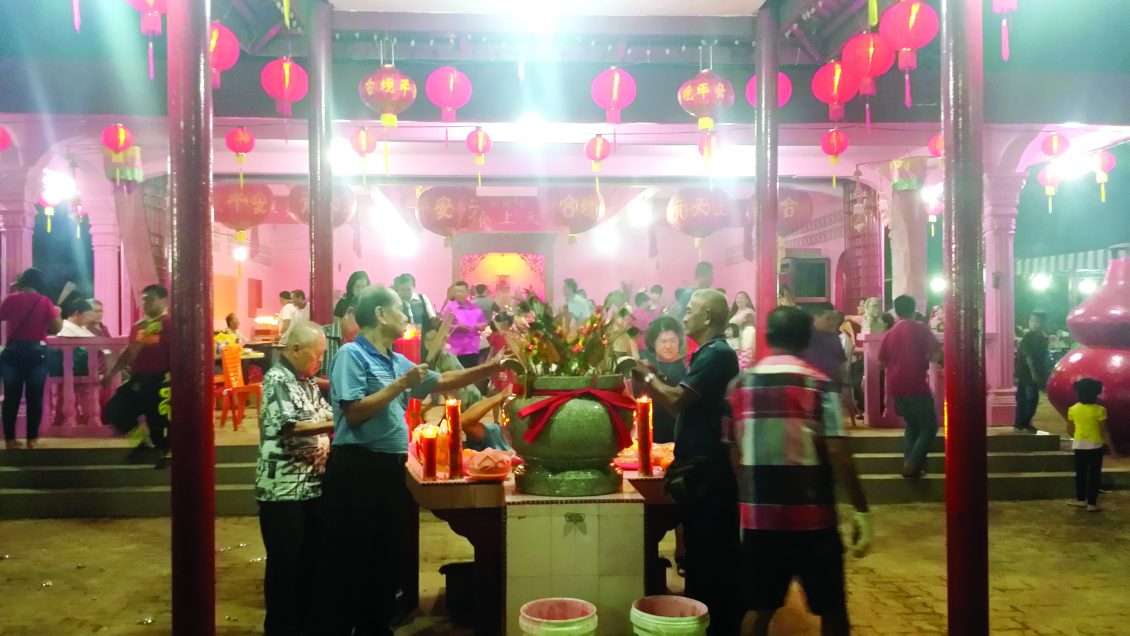 (丹绒槟榔讯)2018年10月17日(星期三)即农历戊戌年九月初九,历史悠久的民丹县(马鞍山)军陇港“元天上帝”神庙宇诞辰日,也是元天上帝神袛成道日,欣逢一年一度举行周年盛大庆典,主办单位由本庙基金会兼炉主陈良德与副炉主蓝应忠及资深顾问蔡来发、蔡素娥、理事许妈界、陈亚强、蓝丰盛……等联合举办庆典活动,(从初八至初九)一连两天。在庙宇两侧围绕悬挂着近百盏红彤彤的圆灯笼,将庙宇四周照得亮丽白昼。本港的善男信女及各界的热心人士献爱心慷慨解囊捐款,在庙左侧空地兴建筑一座(钢骨水泥)伙食厨房,庆典举办的比去年更加隆重,邀请本岛舞龙狮团队前来助兴,锣鼓喧天。此盛事迎来了当地的华族信徒,也吸引了不少其它民丹岛以外地区巴淡岛周围的华族信众及外国贵宾也不少,今晚邀请出席除了政府部门政要人物,各界知名人士,各阶层民众,大家共聚一堂,祭祀进香,热闹非凡,显示出中华悠久传统文化遗下来的美德。除了邀请2位来自马来西亚的两位女歌星冯高美与佳敏之外,还邀请11位本岛女歌手,秋诗姐妹与张月甜、杜彩云/Vicky、丽珍、美珍、爱丽、晓琪、森爱、丽珍、雪玲。在金鹰大乐队(Golden Eagle Band)的半奏下,唱出多首动听歌曲,色彩缤纷,歌声优扬,把场面欢乐气氛推上高峰。