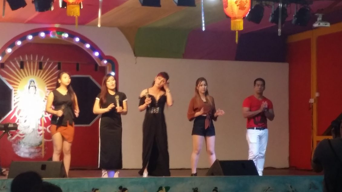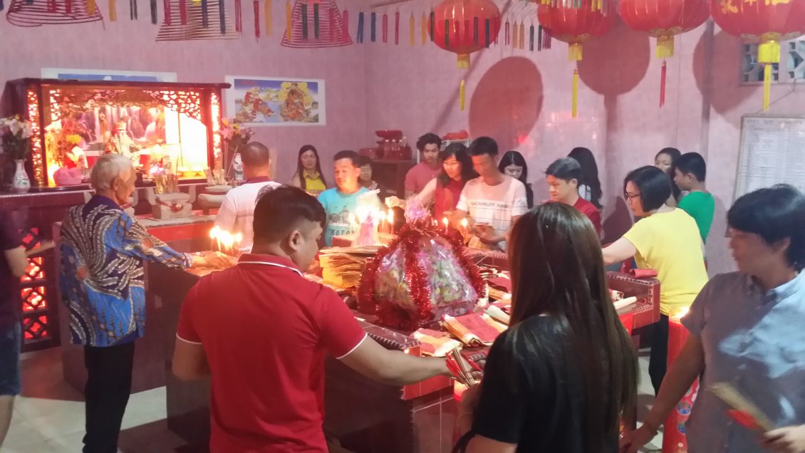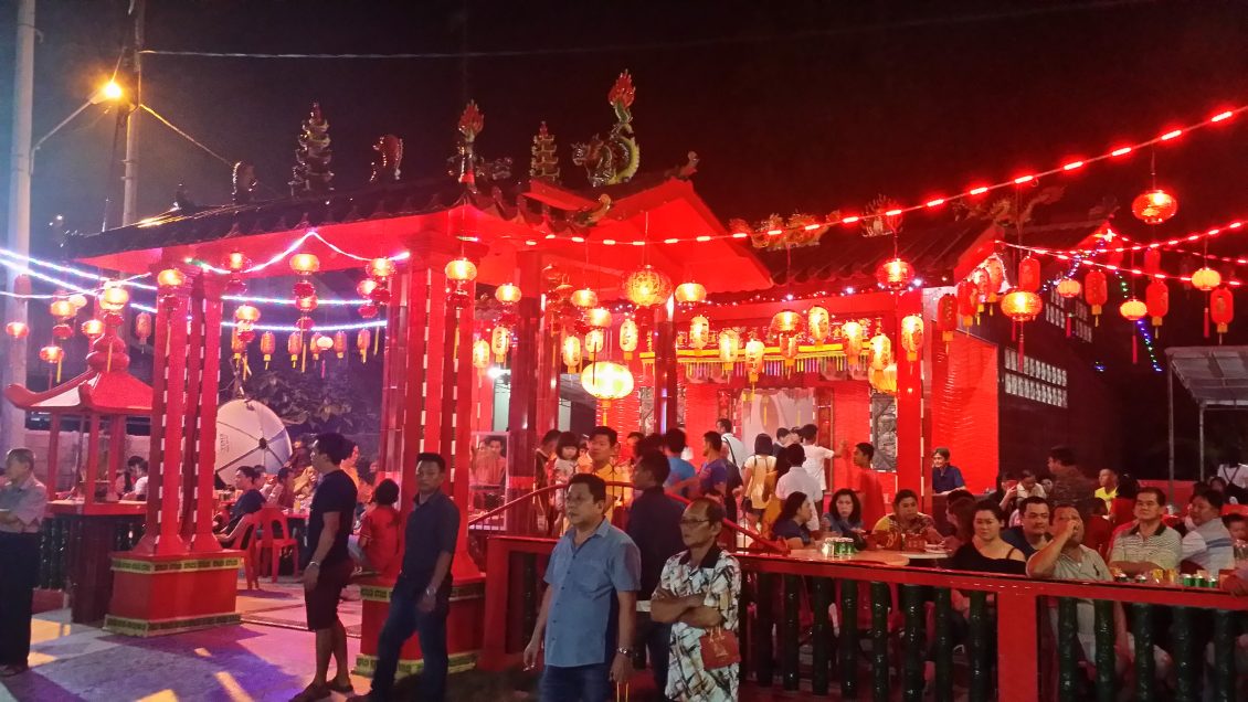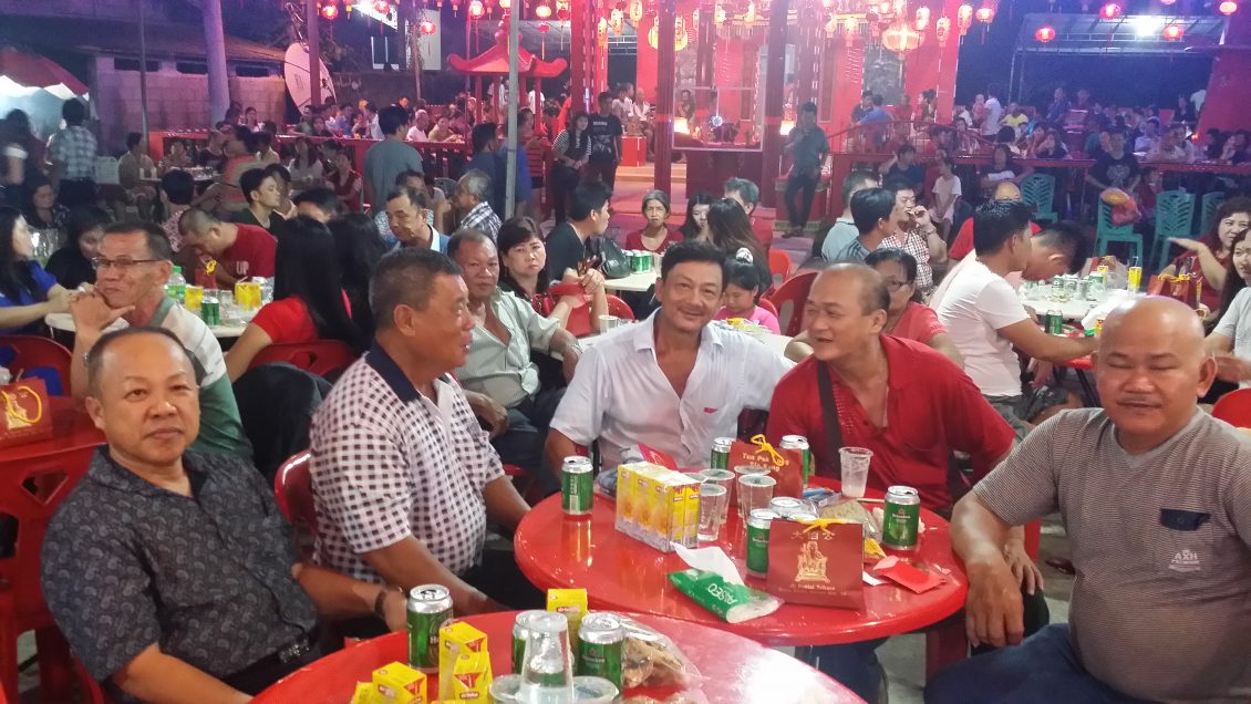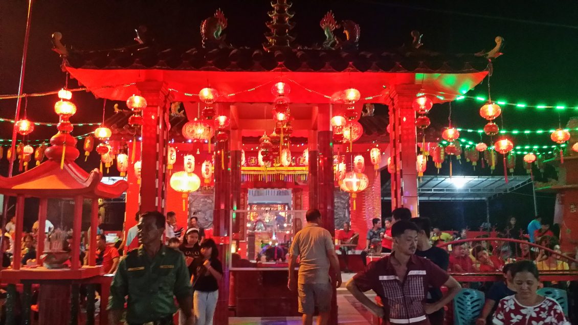 2018年11月8日(星期四)即农历戊戌年十月初一(从三十至初一) 一连两天,位于民丹县东部湾都村(Desa Teluk Bakau,Bintan Timur)“大伯公”(福德正神)庙诞辰日举行一年一度的酬神招标及歌台欢庆会活动,在庙宇两侧围绕悬挂着红彤彤近百盏的红色灯笼,将庙宇四周照的亮丽如白昼。主办单位本庙女炉主纪六妹与夫婿EDI、副炉主李得喜及理事会联合筹办。并邀请本岛印华百家姓协会舞狮团来助兴,还有邀请节目女司仪兼歌手Angel(周月婷)与男扮女妆的小蜜蜂、杨丽珍、罗小琪、及年轻新男歌手在KEN的电子音乐独奏下,唱出多首动听歌曲,歌声悠扬悦耳,节目多姿多彩,气氛热闹非凡。除了来自本港贵宾观赏歌台演唱之外,还吸引了民丹岛附近岛屿的信众们也前来酬神拈香膜拜,祈祷求“风调雨顺,国泰民安”。 九时正女司仪宣布是今晚的“重头戏 ” 节目,也就是今晚庆典最具有华人传统习俗特色的捐标福物,首先合唱一首 “有求必应”祈福歌曲保佑合境大家平安! 接着就开始进行招标福物,在歌台前摆放着各式各样的吉祥福物让贵宾们以开高价标取,福物标出的价钱,全部纳入这次“大伯公” 庙庆典理事会的开支和建修及保养神庙用途。这两天的酬神庆典晚会就在欢乐中圆满结束。