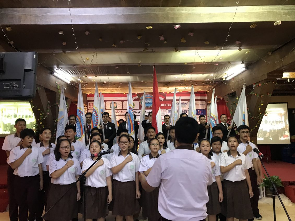 在雄壮的乐曲声中20名理事各手持会旗缓步从大厅走向舞台。随着由必利达一校学生们合唱团领唱“大印