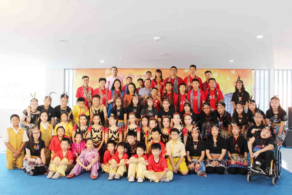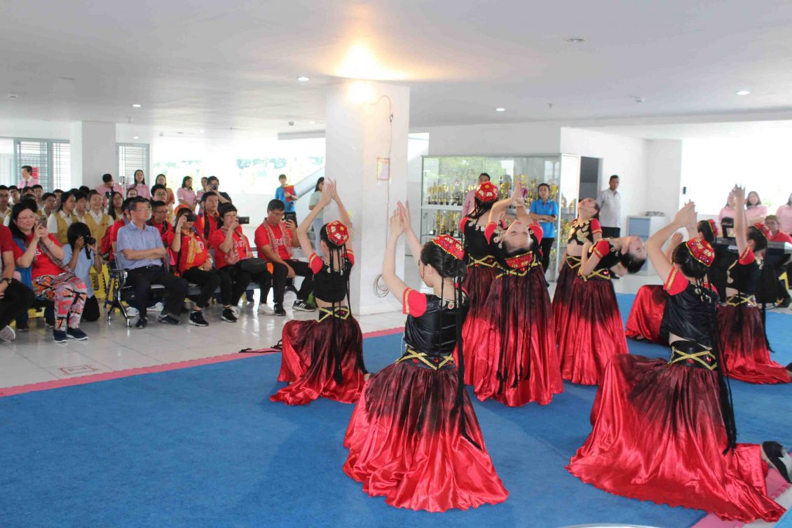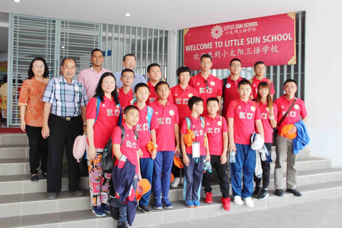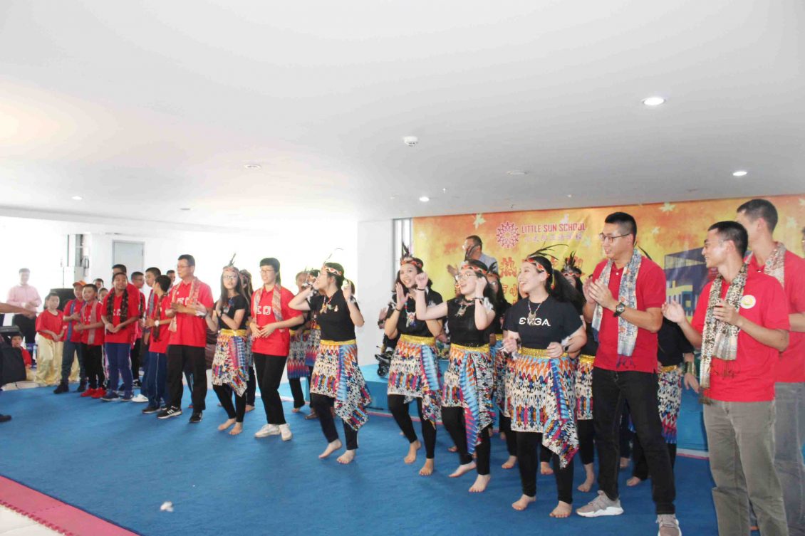 小太阳三语学校学生在欢迎江门市小型足球协会节目中,跳印尼传统舞蹈, 唱歌及展示武术表演。泗水小太阳三语学校总裁张玲玲与其他老师也热烈欢迎江门市小型足球协会,及和他们共进午餐。