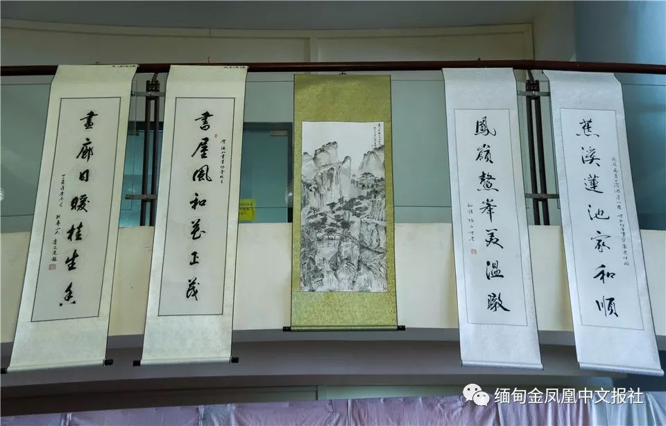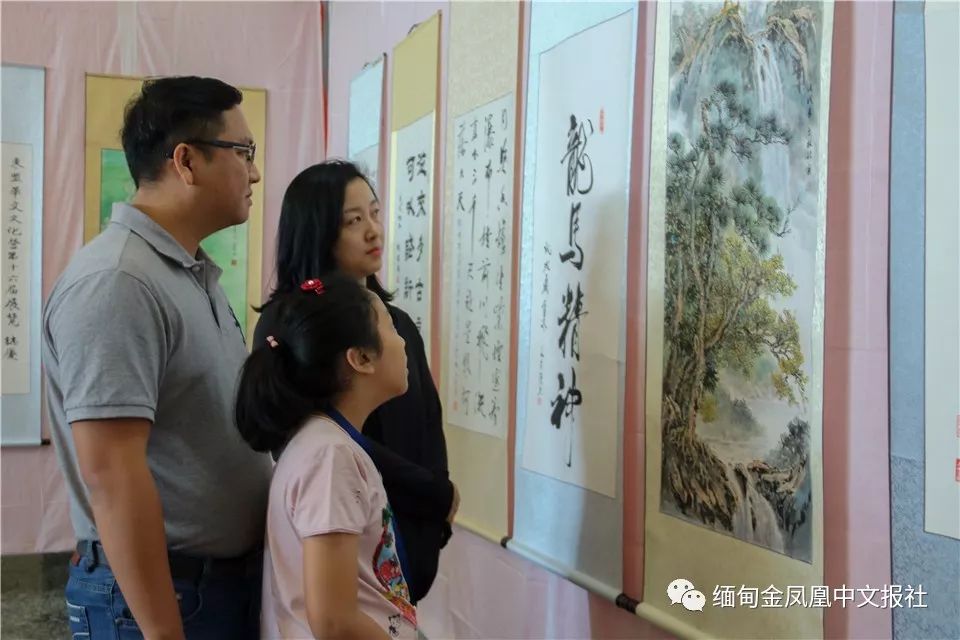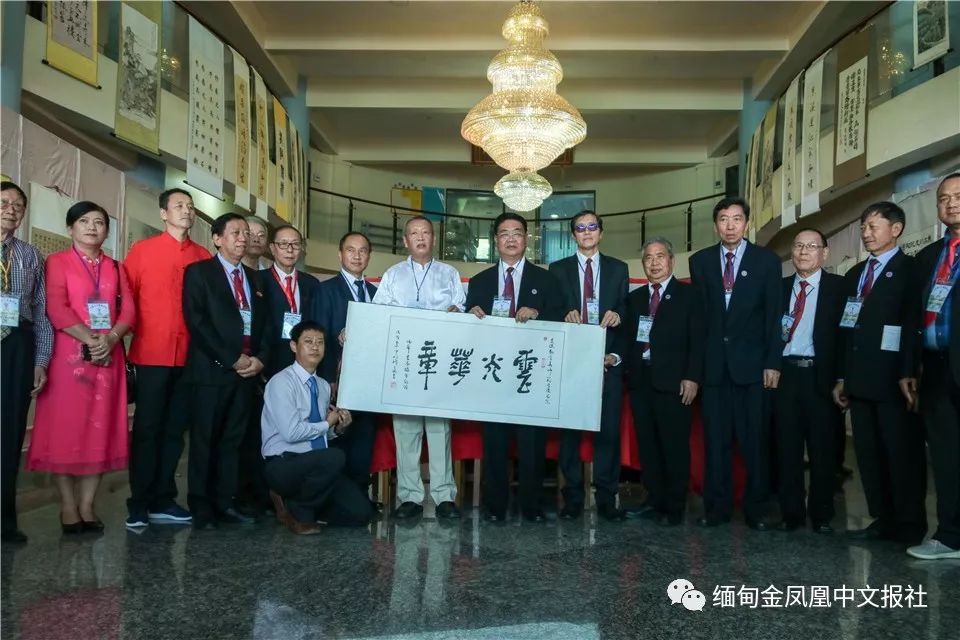 开幕式结束后,各国代表团共同参观了书画展,书画展展出缅华文艺界书法、绘画、篆刻等诸多作品。