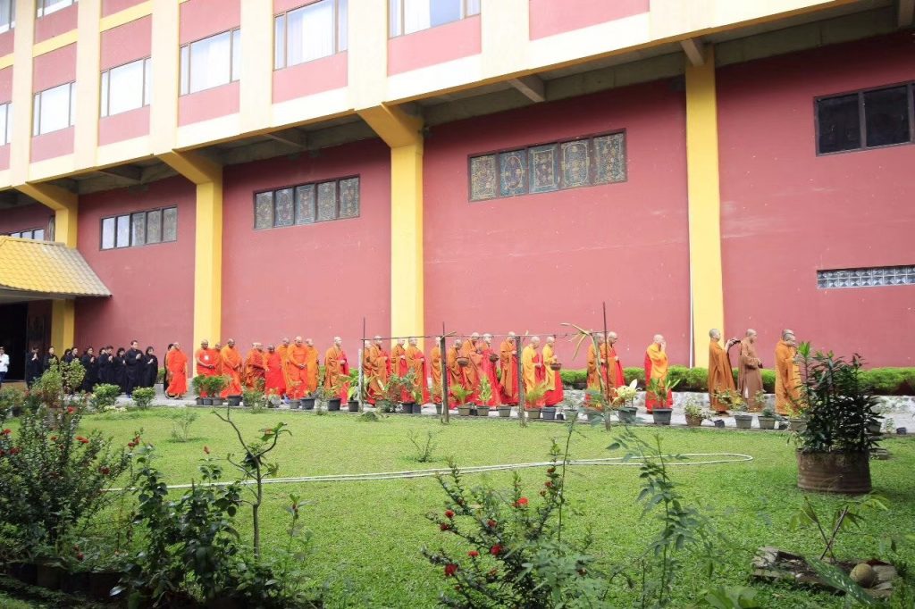 (本山訊)(蘇北——棉蘭)12月25日,農曆十一月十九日,星期二,聖城剛樹立完成六米高觀音地藏以及在東西兩廂房門内四米高的文殊普賢,禮請世佛僧會副會長紹根長老率領42位海内外南北藏傳僧伽主持灑净儀式。鐘鼓起鳴迎請諸山大德進入大殿,諷誦大悲十小咒環繞四堂口並在聖像作爲環繞灑净安坐儀式。長老舉法語,廣品大和尚,般若大和尚,大熙大和尚,慧平大和尚為四大菩薩說四句法語,莊嚴隆重。南傳僧伽贊頌巴利文。紹公對信徒祝賀開光功德,四眾福慧圓滿,增菩提道,法躰安康,得大吉祥。澳洲般若大和尚對信衆説道菩薩安坐灑净,拜懺開壇,如法如律,灑净净壇,希望修持華嚴寳懺能得到清净心來完成菩提善根,共成佛道。