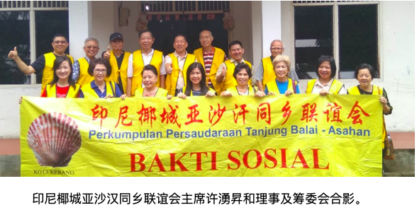 (本报讯)在金猪新年来临之际,印尼椰城亚沙汉同乡联谊会(PerkumpulanPersaudaraanTanjungBalai–Asahan)主席兼筹委会主席许湧昇、谢德友、伍达汉、吴文萍、郭建良等理事于2019年1月27日(星期日)上午在雅加达Citra6地区集合、然后前往万登省丹格朗TanjungKait社区,向此间华裔居民分发250份爱心节日包裹及红包、每包有大米,食油,砂糖,快熟面,饼干等,年糕及红包。