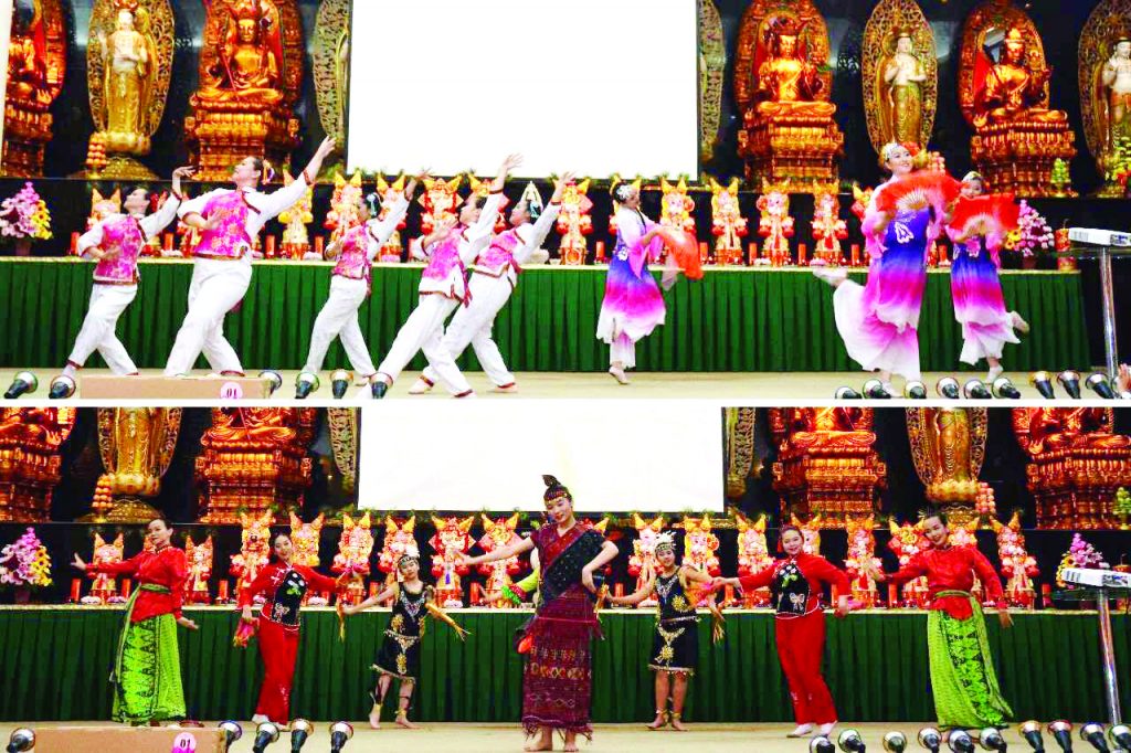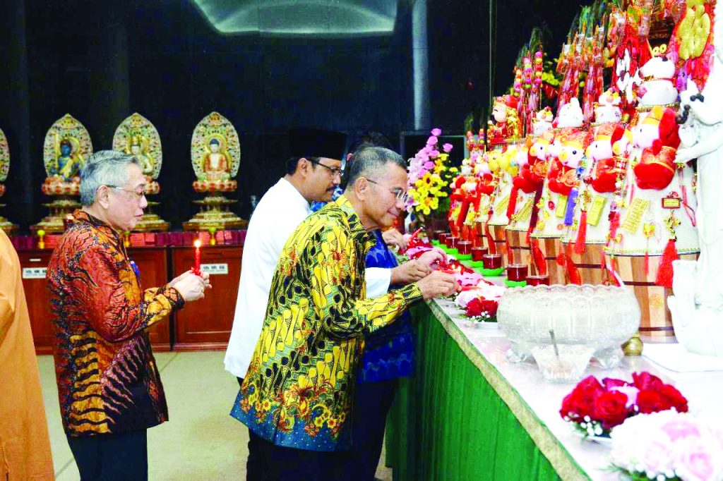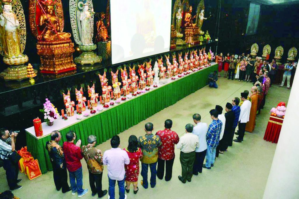 世佛僧會首席副會長兼秘書長,中心協會縂會長慧雄大師父帶領大衆燃燈祈福,全體嘉賓,各宗教領袖一起燃燈。由佛教界誦念經咒,向佛陀拜年,大衆團拜並以華人習俗切大發糕,恭賀恭喜發財。同時,印尼華族舞蹈春少呈現給大衆。