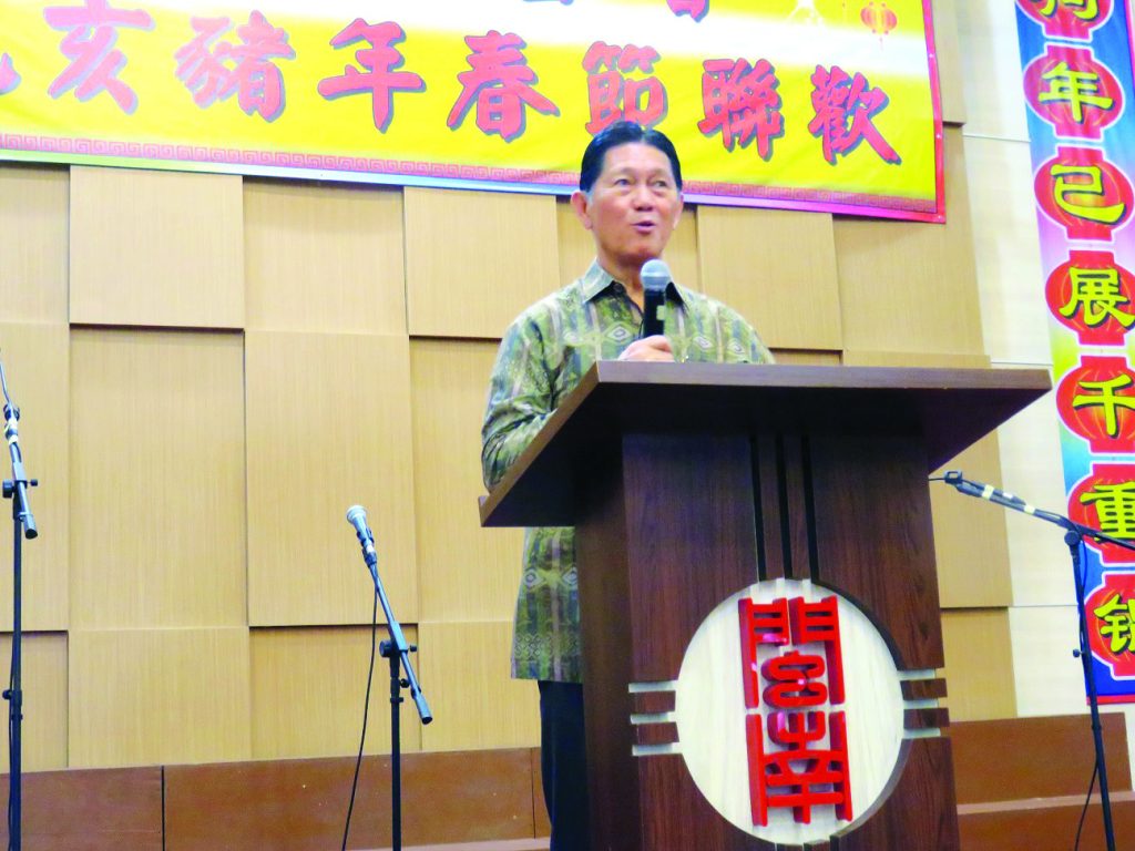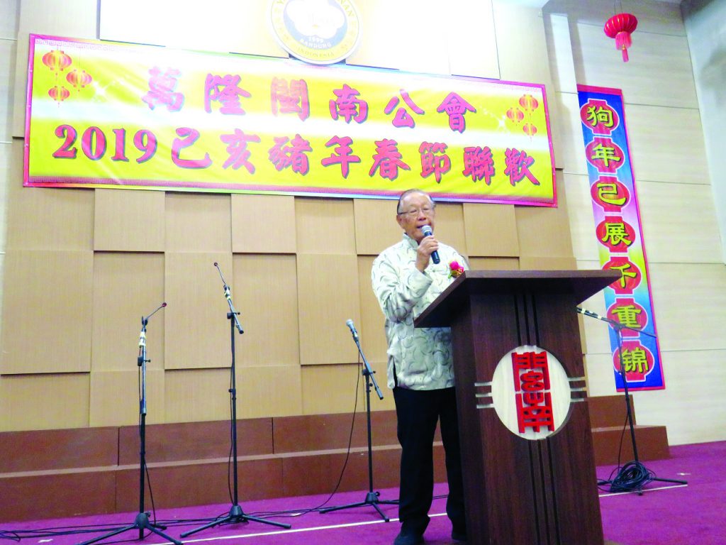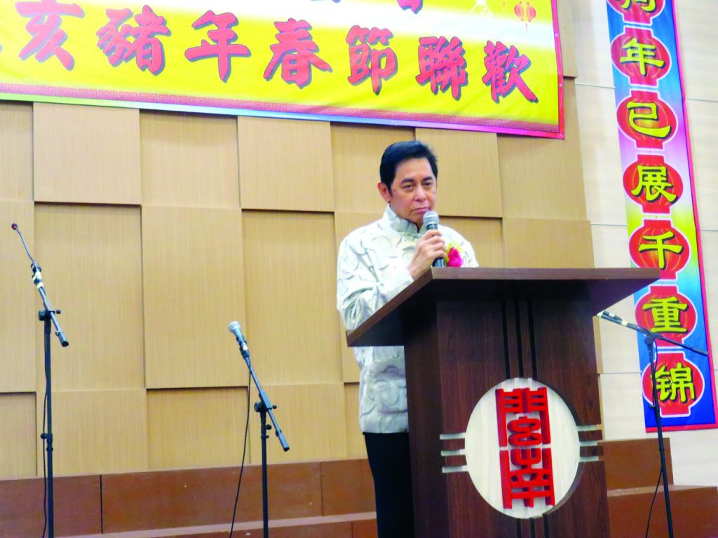 黄积裕主席向大家祝福猪年吉祥后致词说了春节的历史故事和教育意义后说:“时间过得很快,一瞬间我们的闽南公会到今年9月已成立20 周年。20年前,闽南精英在江祖捷和尤世贻两位创会人的带领不成立了万隆闽南公会。我们从无到有,从小变成今天的我们,虽然历经了许多困难,可我们众志成城,团结一心,在2013年建筑了现在的会所,使闽南乡亲有了属于自己的家。我当了11年的理事会主席。我要感谢所有的爱护,关怀,支持帮助我的乡亲朋友,尤其感谢陪同我走过11年的理监事们,我为有他们这帮血浓于水的乡亲理事携手作好会务感到骄傲。很快将到了我交班的时候,我相信接班的理事们会坚持闽南精神,再创辉煌。“