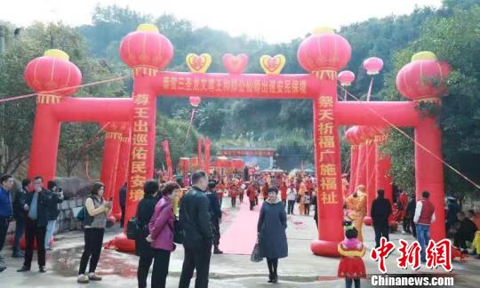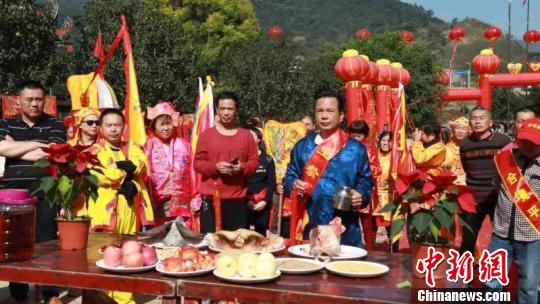 中新网福州3月4日电 (洪鼎平)4日,农历正月廿八,在福建省闽侯县荆溪镇龙迹山祭天祈福坛前,近1000名身穿传统节日盛装的福州市闽侯县荆溪镇关源里各村民众及海外侨胞共同祭天拜圣,接福纳祥,祈盼国泰民安。