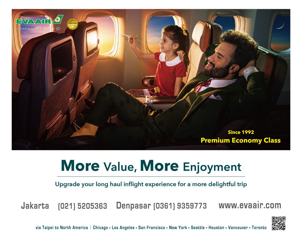 目前波音777-300ER备有豪华经济舱。从印尼出发的乘客, 无论从雅加达或登巴萨, 可在台北进行转机飞往北美的长途旅程,感受豪华经济舱的舒适感。