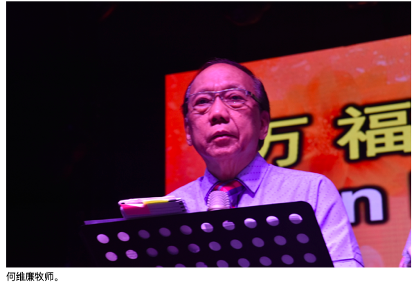 随后,何维廉牧师分享信息“主耶稣这一双手向您伸开”,由陈国平弟兄传译。他说主耶稣的手是钉痕的手(约20:27-29);是得胜的手(约10:27-29);是拯救的手(太14:30-31);是祝福的手(路24:50);是呼召的手(太11:28);是带你走完人世进入天家之手(诗23:1-6)。
