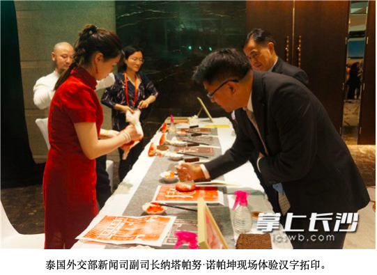 泰国外交部新闻司副司长纳塔帕努·诺帕坤也前来体验汉字艺术的魅力。“我觉得拓印的方式很有意思。”在宋旦汉字艺术体验区,他为出生在猪年的女儿亲手拓印了一份“猪”的生肖汉字作品。“我虽然从未去过长沙,但是我知道毛主席与长沙的渊源。”采访中,纳塔帕努·诺帕坤还热情推介了风景秀丽的清迈,希望更多长沙的游客能在清迈体验难忘的旅行。