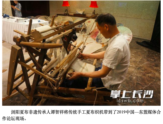 飞梭引线,丝丝入扣——浏阳夏布非遗传承人谭智祥将传统手工夏布织机带到了2019中国—东盟媒体合作论坛现场,他的演示吸引了不少嘉宾的目光。同时,浏阳夏布展示区还带来了钱包、手包、装饰画等传统与现代融合的夏布文创产品和夏布拓染工艺。“我们期待能借助本次论坛踏上‘一带一路’合作快车道,开启文化共融和产业合作的新空间。”浏阳市文化产业园管委会主任高志说。