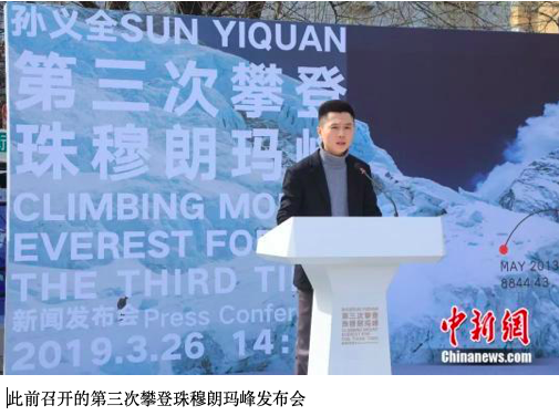 2019年5月21日,尼泊尔当地时间8时35分(北京时间10时50分),艺术家、登山家孙义全成功登顶珠穆朗玛峰。这是他继2013年和2018年后,第三次站在世界之巅,创造了中国民间登顶珠穆朗玛峰次数最多登山家的新纪录。