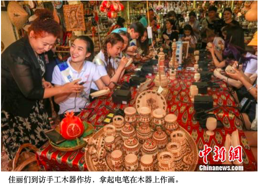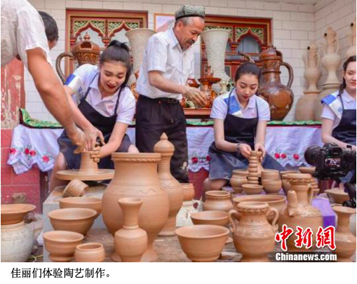 中新网乌鲁木齐6月12日电(张时佳) 参加第59届国际小姐中国大赛新疆赛区总决赛的佳丽们,11日走进新疆喀什古城特色店铺,参与喀什特色手工艺品的制作,深度体验老城区的传统旅游项目,并亲自上阵制作喀什美食。