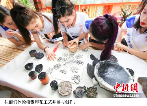 老艺人十分热情地邀请佳丽们现场学习制作木器。在木器师傅的指导下,佳丽们拿起电笔在木器上作画。作为回报,“国际小姐”佳丽们送给木器店一份特别的礼物——刻有“国际小姐”大赛标志以及佳丽签名的木器圆盘。