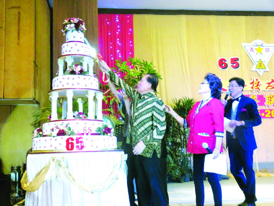 晚7时。由房敦宜司仪主持的联欢晚会先由饶志强老师,董诚章老师,黄秋云校友和李顺南校友共同主持庆祝建校65周年的生日仪式,在欢乐合唱生日歌曲,欢乐拍掌的生日仪式圆满完成。