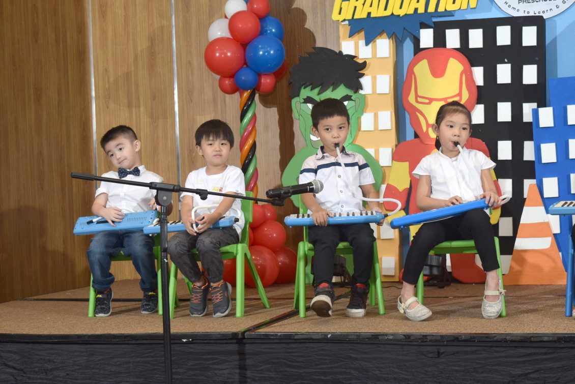 接着唱幼A学生表演英文歌“Let’s go Heroes” 及中文歌“勇敢的小超人”. 后唱幼B学生表演英文歌“Song of Flower” 及中文歌“妈妈听我说”。