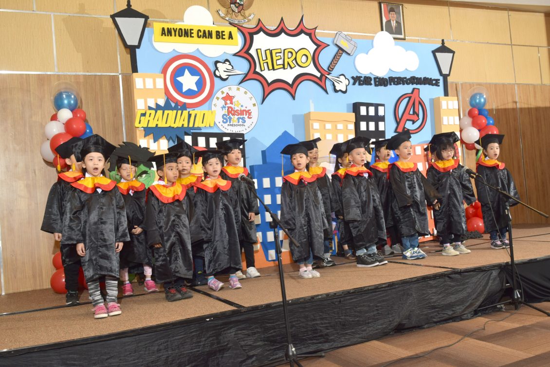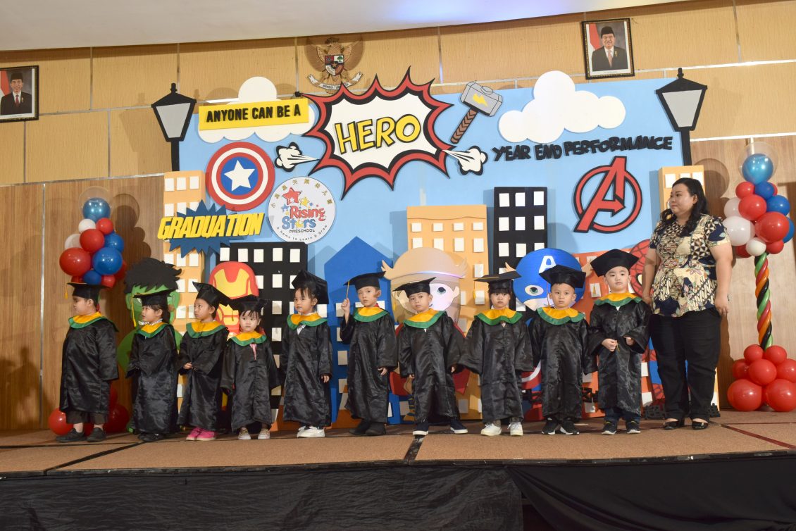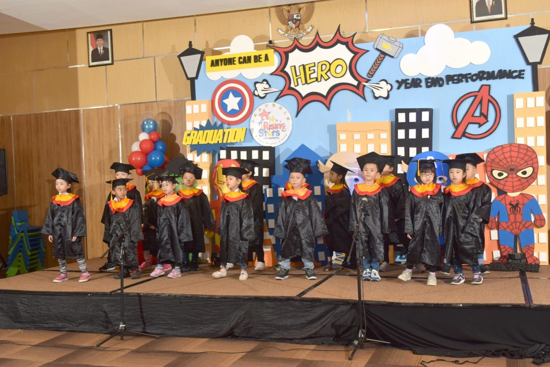 二 零一九年,泗水小星星天赋幼儿园学年结束与毕毕业礼,已在五月二十五日 下午四点假 Jemursari IBIS Style 酒店 顺利的进行。家长们带着孩子们在一小时前聚合,不但孩子们穿上漂亮的衣服,妈妈们 尤其是分派到工作的,打扮得尤其漂亮,因这次的节目,场地装饰也都由家长们安排,孩子们的 毕业礼也够气派,一张大字牌上写着泗水小星星天赋幼儿园第七届毕业礼。