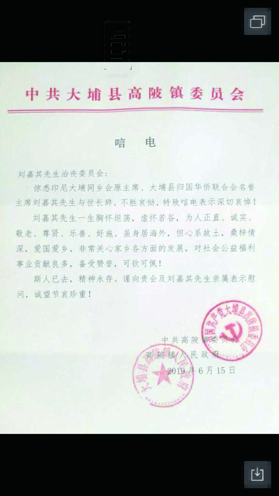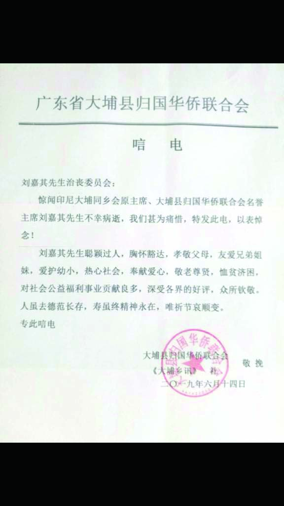 [本报讯]印尼大埔同乡会主席,印尼龙岗亲义总会名誉主席刘嘉其乡贤于2019年6月14日中午12时30分在Harapan Kita医院蒙主恩召,安息主怀,随即将遗体奉移天堂殡仪馆治丧。生于1931年10月8日吉时在世寄居89载。全体家属等随侍在侧亲侍含殓,谨涓于2019年6月18日(星期二)上午10时依基督教仪式举行告别礼,拜礼毕随即扶柩发引于天堂火葬场火化。