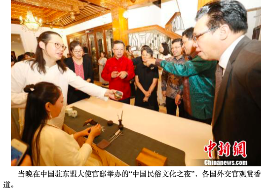 中新网雅加达6月18日电 (记者 林永传)品茶道、赏花艺、闻香囊、观太极。17日下午,印尼首都雅加达东盟秘书处,在珍藏东盟各国和对话伙伴国艺术珍品的东盟艺术画廊里,一场中国民俗文化盛宴陶醉了各国驻东盟外交官。