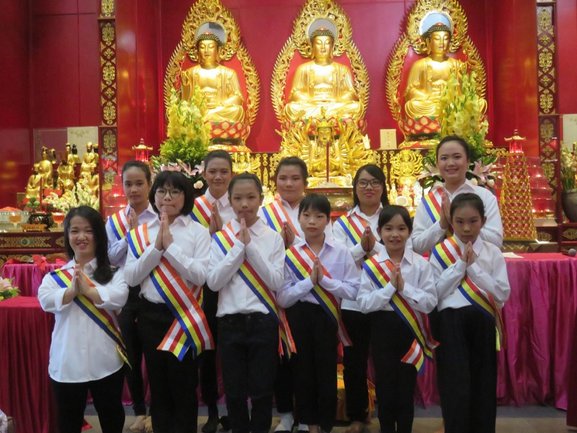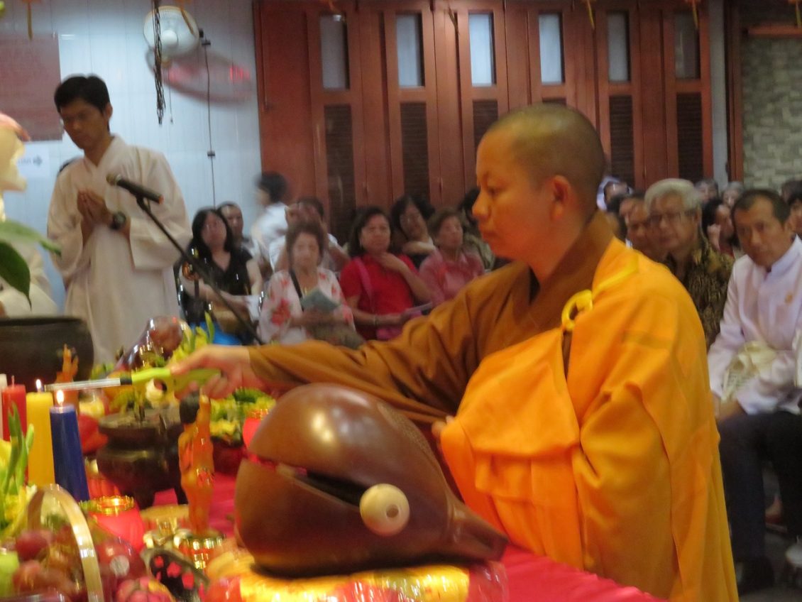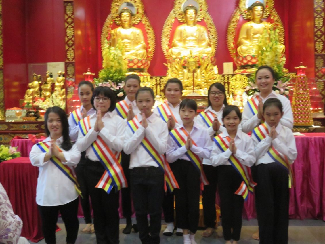 由女法师与佛堂教友带领大家诵经敬拜诸佛的法会进行两个小时。随后大约900 多位众佛友在佛堂理事们安排下,顺序排队浴佛,敬拜佛主圣童雕像,祝愿大家平安吉祥,国泰民安。家庭美满。
