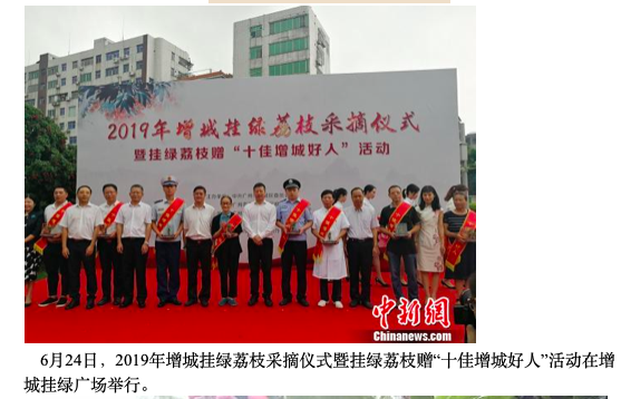 中新网广州6月24日电 (记者 程景伟)广州增城是著名的“中国荔枝之乡”,当地24日举行了2019年挂绿荔枝采摘仪式暨挂绿荔枝赠“十佳增城好人”活动。