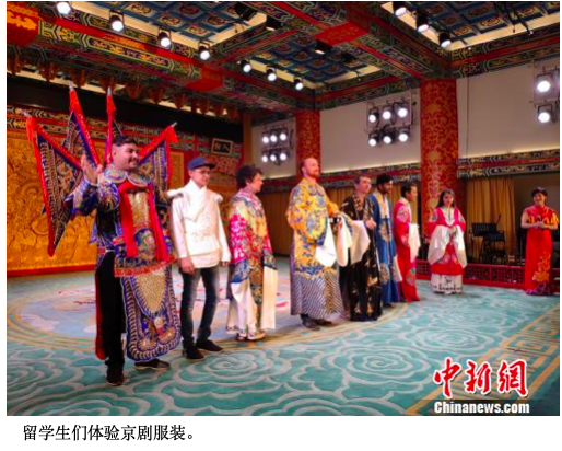 随后,艺人们演奏的京剧曲牌《夜深沉》,让留学生和外教们屏气凝神,沉醉在中国传统音乐的魅力之中;《财神赐福》表演中,财神爷富态可掬,时而表演绝技吐火,时而向台下抛糖果等做成的金元宝,逗得观众捧腹大笑;川剧变脸、齐天大圣表演引得大家争相拍照留念。