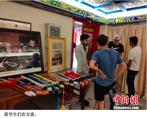 京剧课结束后,撒加达与同学们在后台进一步体验了各式京剧道具。“我会在网上分享这次学到的东西。”目前在中南大学读研究生的撒加达说。