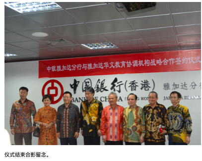 (本报讯)6月25日(周二),中国银行雅加达分行与雅加达华文教育协调机构(以下简称“雅协”)签署战略合作协议。中国银行雅加达分行行长张朝阳和雅协执行主席蔡昌杰代表双方签约。中国驻印尼大使馆文化处参赞周斌,雅协常务副主席兼秘书长颜培椿、主席张锦雄、荣誉主席游继志、胡素丹等共同见证签约。中国银行雅加达分行行长助理杜其奇、业务发展部总监刘越,雅协相关部门负责人林瑞莲、卢鹏等,相关媒体负责人赵金川、邝耀章、李卓辉等及中印尼媒体记者参加了签约仪式。