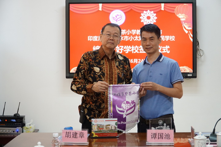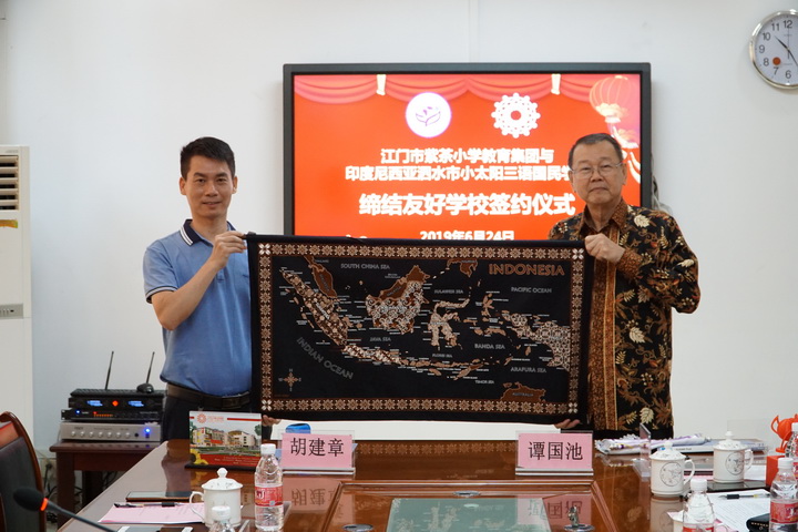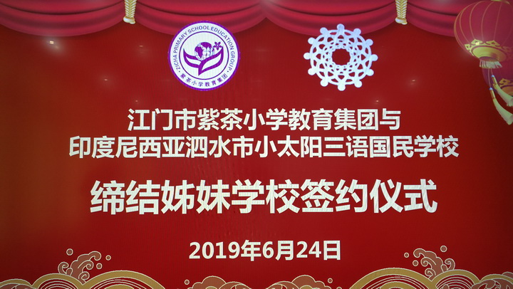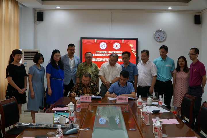 这一天在江门市人民对外友好协会秘书长刘宁,江门市侨联秘书长、经济科技部部长雷久艳,江门市蓬江区教育局主任科员湛飞帆,江门市小型足球协会会长张书羿等的见证下,谭国池校长与胡建章校董代表两校签署【友好学校协议书】,开启了两校在江门市和泗水市友好城市建设进程中,以及在中国“21世纪海上丝绸之路”和印尼“全球海洋支点强国”的融合发展新时代新进程中,迈开合作交流的新路向和新进展;紫茶小学将争取落实于今年8月份派出优秀教师到泗水小太阳三语国民学校对当地老师进行为期12-15天的短期培训和交流;江门市小型足球协会也将在11月份组织紫茶小学学生足球队对小太阳学校的足球访问联谊和比赛。而小太阳学校由于已安排今年的冬令营在广西华侨学校举办,则筹备与紫茶小学合作筹备举办2020年的冬令营;在回程胜利车站的路上,胡建章主席也与张书羿会长协商合作参与在九月初江门市侨联举办的第一届侨界青少年运动会的足球比赛。“而今迈步从头越”,衷心希望两校逐步推出交流与合作的新办法、开展新举措,真抓实干,努力取得丰硕的新成果。