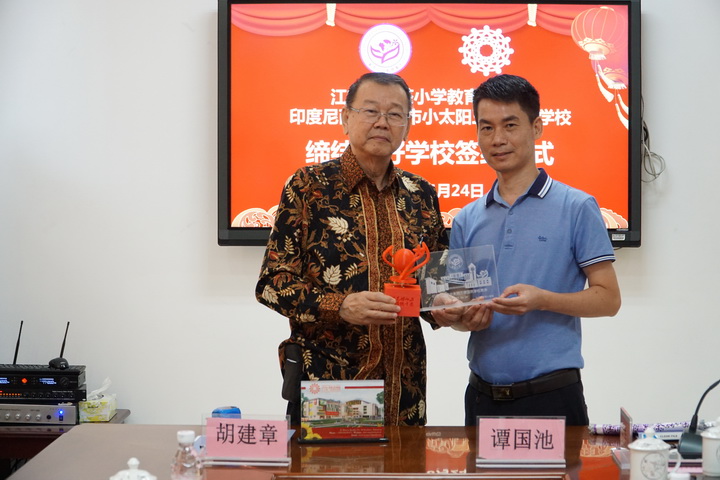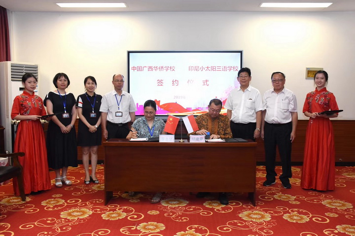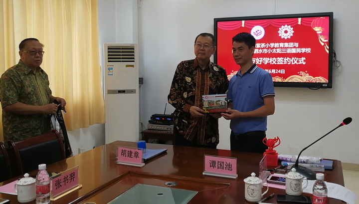 继6月18日由印中文化交流基金会主席、泗水市小太阳三语国民学校校董、江门-泗水交流促进委员会主任胡建章,中国侨联委员、广西侨联顾问、澳门广西社团总会副会长温深文,江门-泗水交流促进委员会副主任兼总干事、印尼《千岛日报》记者、《广东侨友网》攒稿人黄抵江等三人组成的印尼泗水市小太阳三语国民学校参访考察团在南宁市与广西华侨学校签署【友好学校协议书】之后。