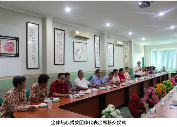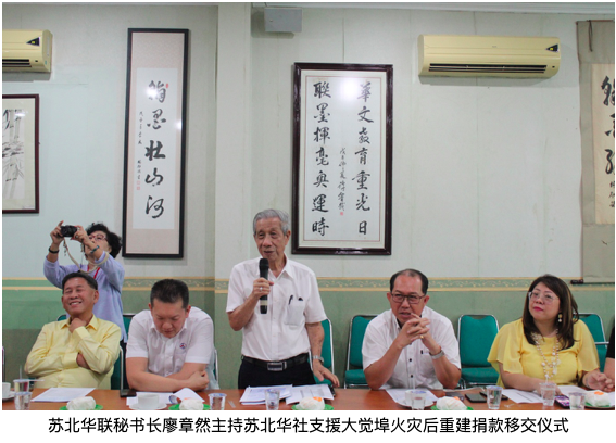 前天(7月8日)下午二时,苏北华联邀请全体捐款的华社团体代表或个人,与大觉埠灾后重建委员会代表,齐集苏北华联会议室,举行简单的捐款移交仪式,苏达人代表苏北华社,陈明宗代表颍川堂及苏北印中商务理事会,黄耀庆及李鸿章代表棉兰日里扶轮社,分别将捐款移交大觉火灾后重建委员会代表,他们分别是顾问谢永成,杨建生,财政林珠鸾,庄赛娥及陈碧云。