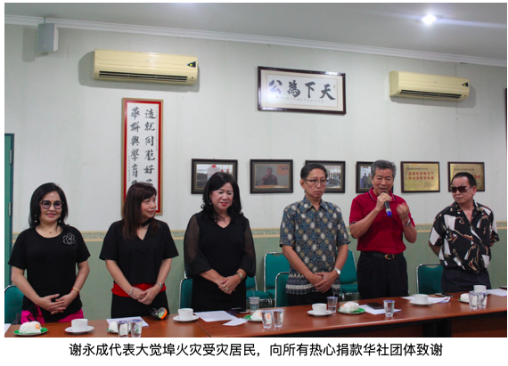 大觉埠中人士及旅外同乡热烈响应,踊跃捐献,苏北华联理事长苏用发,执行主席徐煜权,适因公务都在国外,连夜打来越洋电话,指示理事会发动苏北华社团体捐款捐物,支援大觉火灾受灾兄弟,棉兰鹅城慈善基金会闻讯首先响应,带头捐款,苏用发主席,苏北华联青年组,广肇同乡会,潮州公会,苏氏宗亲会,六桂堂,福州三德同乡会,延陵吴氏宗亲会,莊严宗亲会及许多宗乡团体或个人,纷纷捐款,仅在短短的一周之内,就已筹集义款Rp. 300.950.000,-。