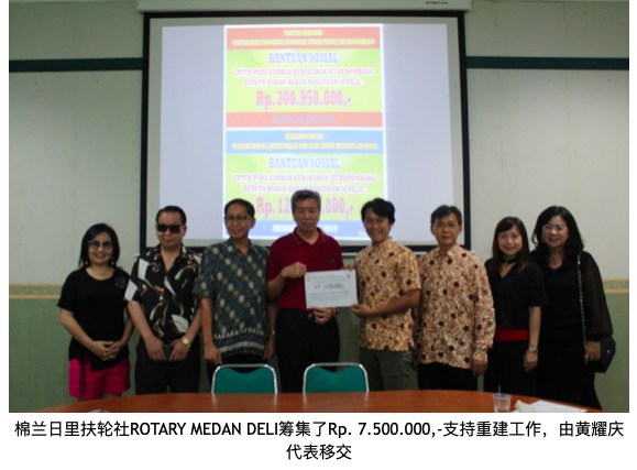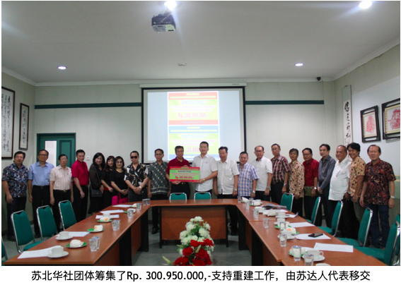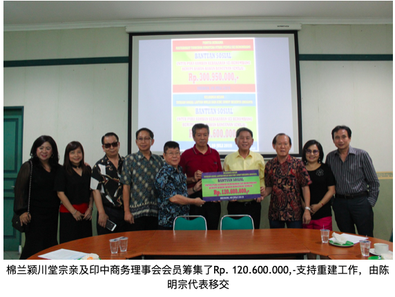 苏北华联主席团成员,颍川堂主席,也是苏北印中商务理事会主席陈明宗,积极动员颍川堂宗亲及印中商务理事会会员热烈捐款,仅在数天内就筹集了Rp. 120.600.000,-。棉兰华社的爱心行动,赢得广大社会的好评。棉兰日里扶轮社ROTARY MEDAN DELI也筹集了Rp. 7.500.000,-支援重建工作。