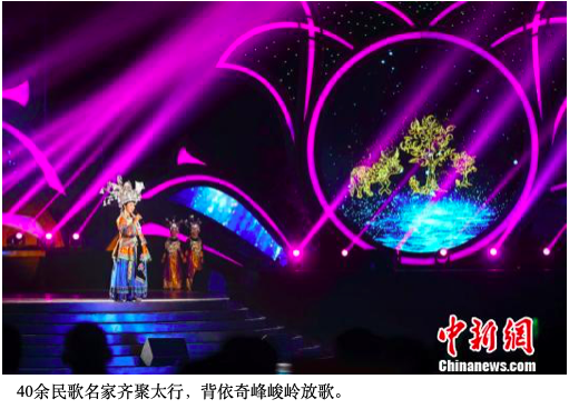 中新网晋中7月9日电 (杨佩佩)左权民歌汇·2019年国际民歌赛8日晚在中国红色县城左权开幕,40余民歌名家齐聚太行,背依奇峰峻岭放歌。来自中国、美国、乌克兰、俄罗斯等国家的70名民歌选手将在未来10天决出2019年中国民歌王。