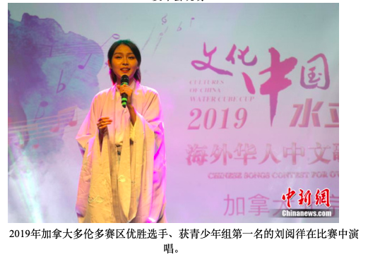 “文化中国•水立方杯”海外华人中文歌曲大赛(原名“水立方杯”海外华裔青少年中文歌曲大赛),自2011年以来,已连续成功举办八届,共吸引了海外30多个国家和地区的3万余名选手报名参赛,受到了海内外的广泛关注和一致好评。