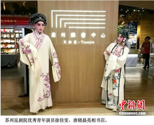 书店快闪环节,选择在人流涌动的商场中进行,苏州昆剧院优秀青年演员徐佳雯、唐晓晨来到广州购书中心天津店,向市民全程展示戏剧化妆的全过程,专业戏曲推广人杨蕾向市民讲解昆曲扮相的相关知识,书店内众多观众驻足观赏。