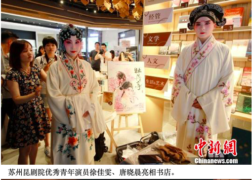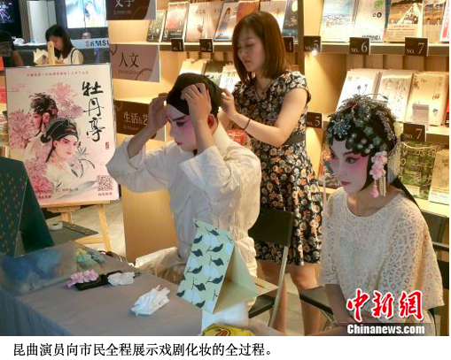 书店快闪环节,选择在人流涌动的商场中进行,苏州昆剧院优秀青年演员徐佳雯、唐晓晨来到广州购书中心天津店,向市民全程展示戏剧化妆的全过程,专业戏曲推广人杨蕾向市民讲解昆曲扮相的相关知识,书店内众多观众驻足观赏。