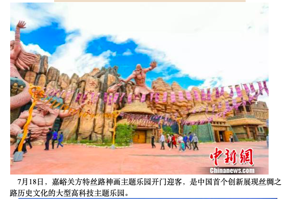 已筹备数年的嘉峪关方特丝路神画主题乐园当日开门迎客。深圳华强方特集团总裁刘道强说,方特丝路神画是以丝绸之路文化特色为背景,进行区域定制化打造的大型主题乐园,以丝路文化、长城文化、华夏历史文化、边塞古城文化、民俗文化等多种类文化主题为创意基础,带领游客梦回西域,重走丝路;再看华夏文明传播世界,领略文化艺术瑰宝的魅力;结合新时代的科技,将绚丽多彩的华夏文化画卷展现在民众面前。