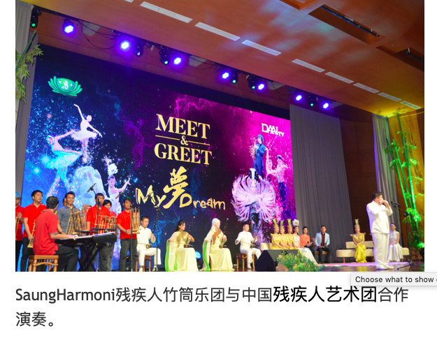 随之,代表团一行与大家分享了“我的梦”(MY Dream)的心路历程以及愿望的实现。现场他们还表演了精彩的“千手观音“和”孔雀“舞,另与本地的SaungHarmoni残疾人竹筒乐团合作演奏了印尼民族歌曲,两者的默契与良好协调,获得了观众的阵阵掌声。