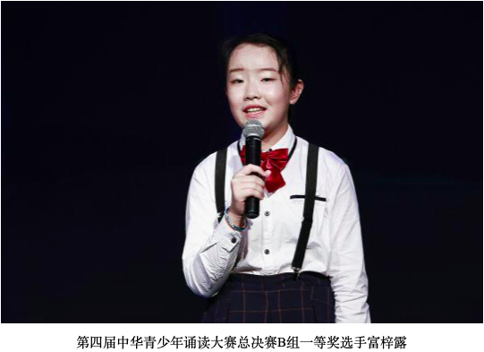 经过激烈角逐,富梓露、和文俊、林雨萱获得第四届中华青少年诵读大赛总决赛一等奖,李淼获得首届全国中小学课文诵读大赛大赛总决赛一等奖,另外还颁出了二等奖6名(自由组6名、课文组2名),三等奖9名(自由组9名、课文组3名),优胜奖30名(自由组20名、课文组10名),单项奖12名(不分组),同时富梓露、李淼、和文俊、林雨萱、严子涵、孙浩祺、徐仕尧、蒋妮睿、黄俊皓、张宸等入选第四届中国十佳诵读小明星。