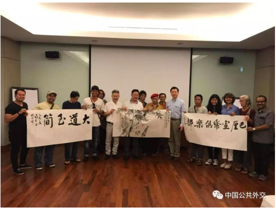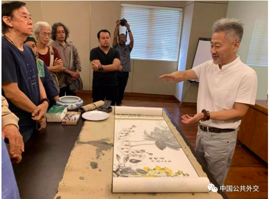 刘南平与巴厘岛艺术界人士进行了交流,并现场泼墨作画,增进了相互间的了解与友谊。