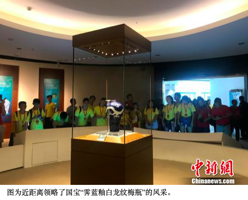 扬州博物馆最出名的是“国宝厅”。在近200平方米圆形展厅,只展出了一件藏品,远远望去,是一件蓝白色相间的瓷瓶。博物馆工作人员介绍说,这件藏品是扬州博物馆的“镇馆之宝”–元霁蓝釉白龙纹梅瓶。在灯光的映照下元霁蓝釉白龙纹梅瓶透过玻璃显露出“雄”“秀”之美,57名海外华裔青少年目光聚焦于此,细品着中华文明的璀璨。